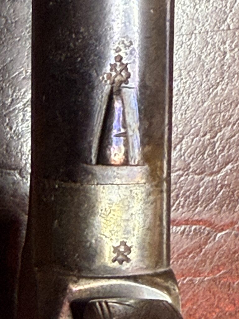 Scottish pistols frequently show continental influences (Belgian proof-like stars or simple marks are not unusual), as Scottish makers often sourced barrels or components, then finished and signed locally.